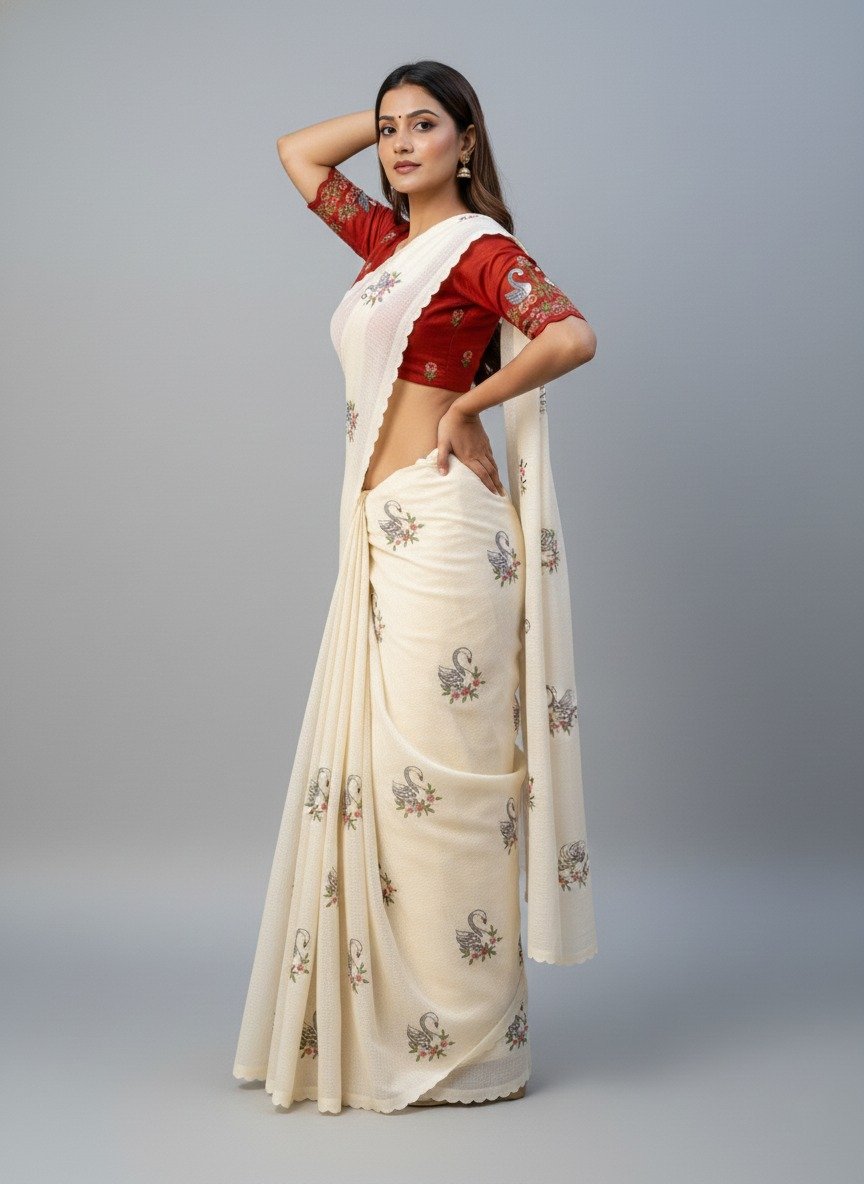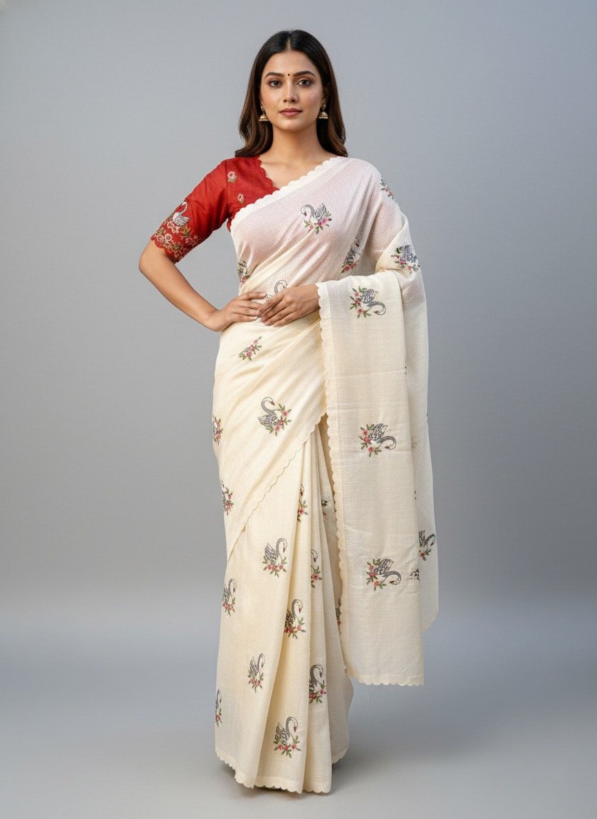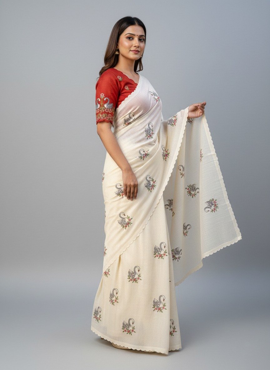 This pure Kota Doriya saree comes in a soft ivory tone and is beautifully detailed with swan embroidery buttas spread across the saree. The fabric feels light, airy, and comfortable, making it a perfect choice for long hours of wear, especially in warm weather.