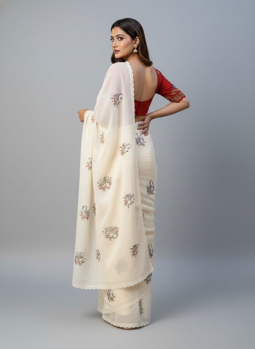 The saree is finished with a delicate scalloped cutwork border, adding a graceful edge and a refined look. The fine embroidery work brings a subtle charm without making the saree look heavy, keeping it elegant and wearable for both day and evening occasions.
