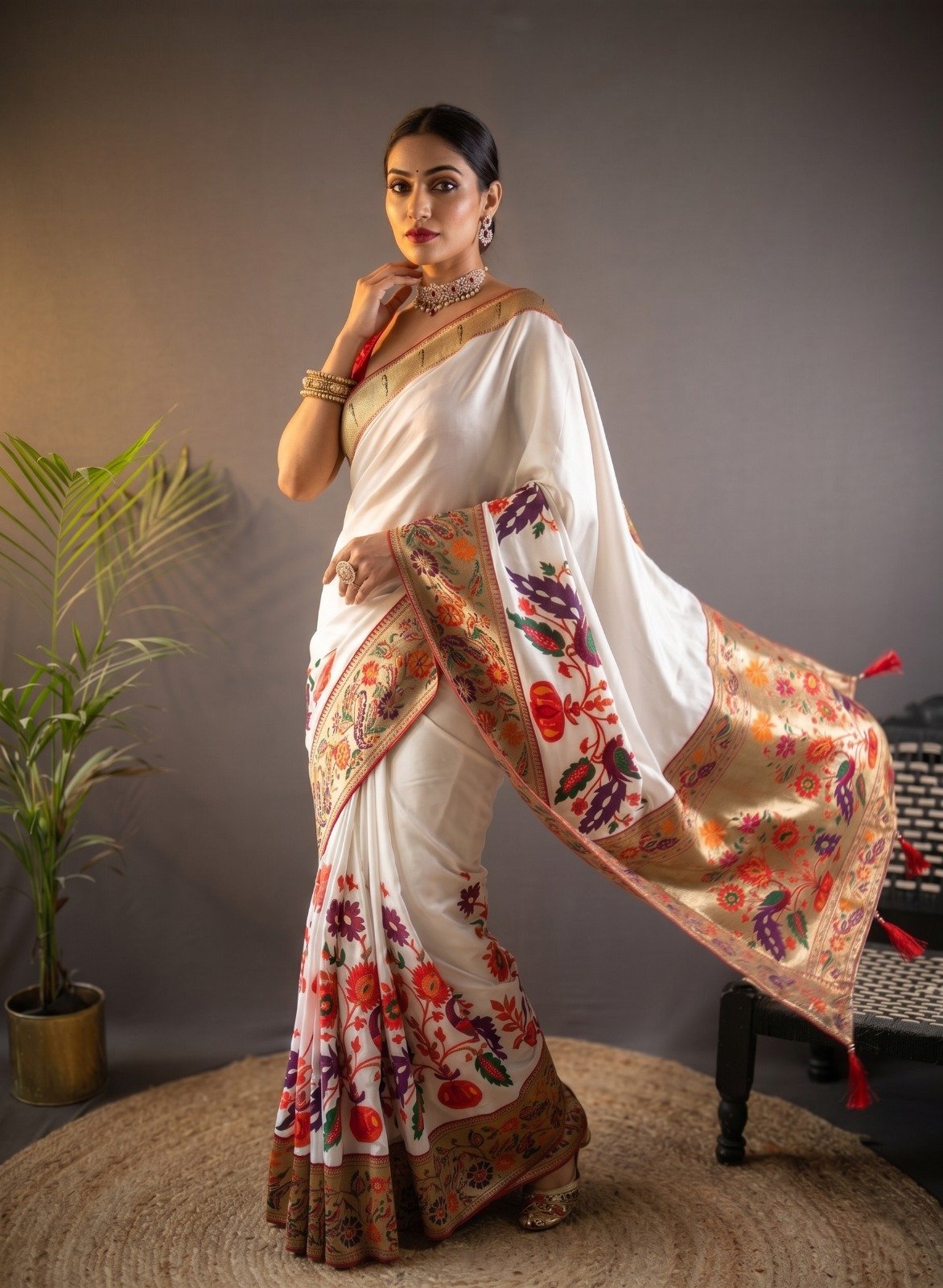 Elegant off-white Kanchipuram silk saree with vibrant floral motifs and a rich woven border, designed for a graceful drape and timeless festive look.